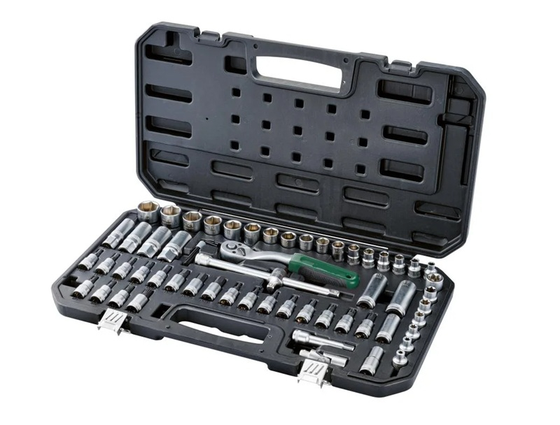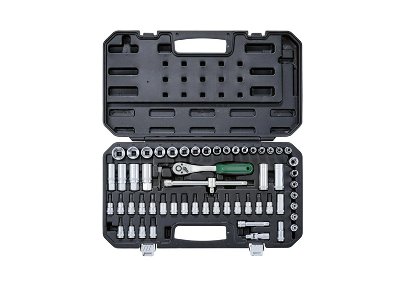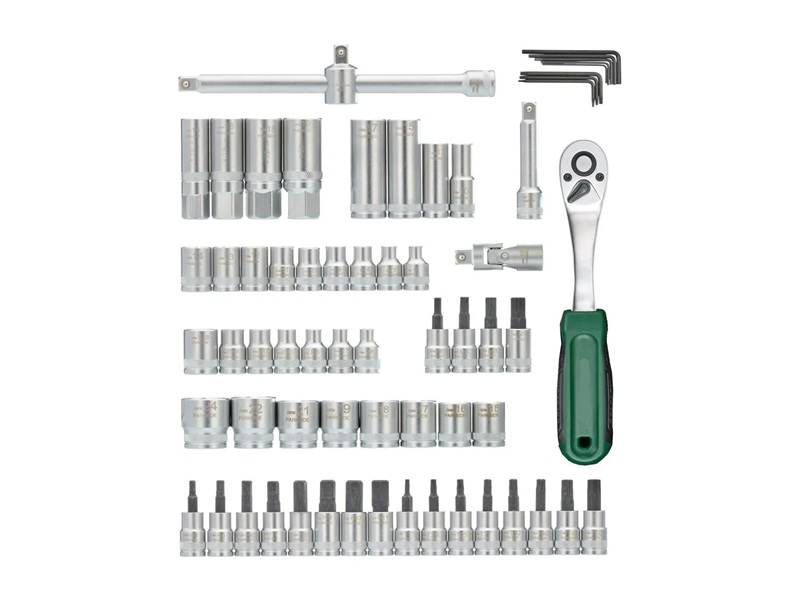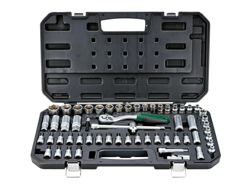 65 dielna sada s orechmi 6-7-8-9-10-11-12-13-14-15-16-17-18-19-21-22-24mm. Z chróm-vanádiovej ocele CR-V a ocele S2 s 3/8" (10 mm) upínaním. 1 ergonomická račňa, prestaviteľná doprava / doľava (72 zubov), zahnutá a rýchlouvoľňovacia. 1 predlžovací nadstavec 75 mm. 1 predlžovací nadstavec 200 mm. 1 klznica. 1x kardanový kĺb. 4 kľúče na zapaľovacie sviečky s laserom vyrytým piktogramom zapaľovacej sviečky. 4 prehĺbené bity. 17 bitov na nástrčný kľúč. 20 bitov na skrutkovač. 7 bitov na nástrčný kľúč v tvare E. 5 imbus kľúčov. 3 torx kľúče. In matt-finish – dobre rozoznateľné veľkosti vďaka laserovému označeniu. Vrátane praktického plastového kufra 47,5 x 27,5 x 5,5 cm. Hmotnosť 3,2kg