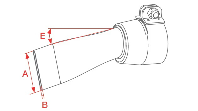 Preplátovacia násuvná rohová tryska 20mm, 60º vyhnutá, (ľavá) pre prístroje TRIAC s pripojením ø 31,5 mm. Dĺžka štrbiny (A) 20 mm, Šírka štrbiny (B) 2 mm, Uhol (E), 60°.