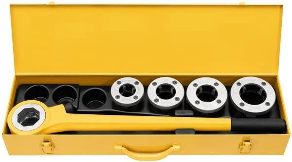 Ručná závitnica na trubkové závity R 1-1 1/4-1 1/2-2˝. Račňa, rýchlovymenitelné závitorezné hlavy. V pevnom kufri z oceľového plechu.