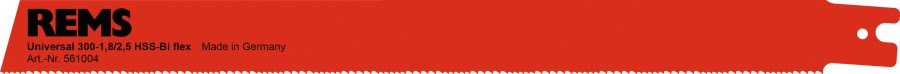 Univerzálny pilový list na rezanie volne z ruky a na rezanie so silou prevádzajúcim vodiacim držiakom (zverákom). Miesto mnohých roznych pilových listov len jeden univerzálny pilový list na všetky rezacie práce. Pevný, pružný materiál HSS-Bi, tiež na rezanie pri stene. Výmenná vzdialenosť zubov (kombo-ozubenie), v oblasti zubov zvlášť kalený. Na oceľové, nerezové trubky, kovové profily, drevo s klincami-palety, okná a pod. U liatinových trubiek nutný nižší počet zdvihov-použiť preto pilu REMS Tiger ANC SR s elektronickým riadením počtu zdvihov. Dĺžka 300mm, vzdialenosť zubov 1,8/2,5(kombo). Balenie 5ks v blistri.