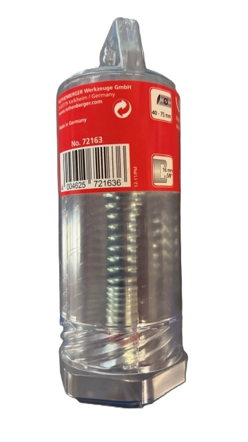 Rothenberger štandardný nástroj k prevŕtaniu textilných a papierových upchatí s maximálnou flexibilitou i v záhyboch a oblúkoch. Pracovný rozsah od 40 do 75 mm. Vonkajší priemer nástroja: 28 mm, dĺžka 115mm. Hmotnosť: 70 g. Spojka:16mm (5/8")