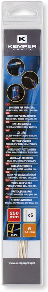 Kvalitná Kemper tvrdá spájka Cu 60% + striebro 40%. Priemer Ø 1,5 mm. 6 ks v balení / l = 250 mm. Pevnosť 440N / mm2. Teplota tavenia: 640°C. Čistá hmotnosť: 24 g. Na tvrdé spájkovanie železných a neželezných materiálov.
